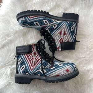 NO TWO ALIKE! Each cut is positioned in a different area. 70% Silk and 30% Cotton fabric hiking boots with unique geometric pattern done in a modern design with leather trim.