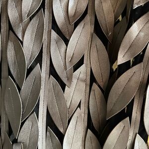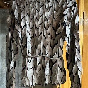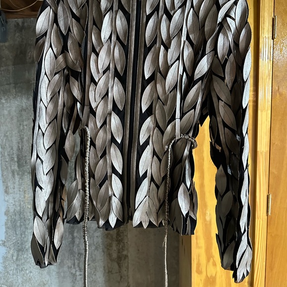 Chic blazer with a striking leaf design. Black and cream tones. Perfect for a sophisticated look. Leather leaf appliqué.