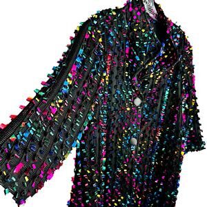 Weavz Vintage multi-color rainbow ribbon jacket. Black mesh material with metallic colors. Button front fully lined with 3/4 sleeves, 100% Polyester. Women's XL.