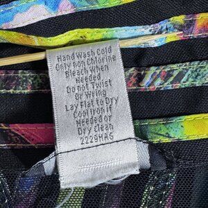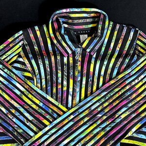 The Weavz Soutache Multicolor Ribbon Jacket is a stylish and eye-catching outerwear piece designed for women in size XL. The polyester outer shell has a lining of 93% nylon & 7% spandex. This mid-length jacket features a soutache style ribbon tie-dyed look. It has a front zipper closure. Perfect for casual occasions, this jacket from the brand Weavz offers both fashion and functionality with its hand wash or dry clean care instructions. Stand out from the crowd with this vibrant and unique jacket that is sure to make a statement. Superb pre-owned condition, no rips, stains, or tears, no signs of wear.