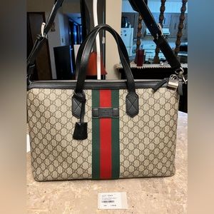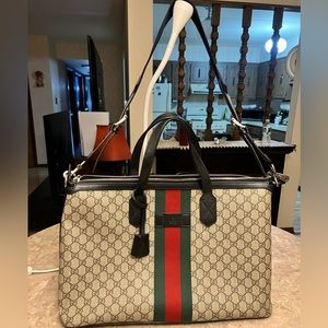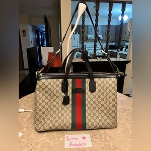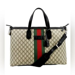 Introduced within the … Savoy line, this duffle bag is crafted from beige and ebony … … canvas combined with the distinctive combination of the House Web with Double G hardware. The top-handle shape is also equipped with an adjustable canvas strap so it can be worn on the shoulder. A secure zipper closure completes the silhouette.