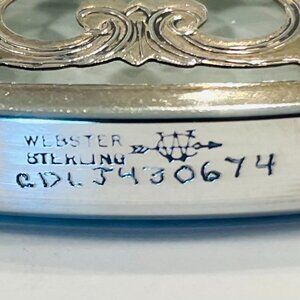 Webster is known for sterling silver. This gorgeous decorated floral chasing and engraving trivet on the glass is marked, symbolized and numbered by Webster American Silver. The condition is excellent, and measuring 6" diameter and 2mm depth. The signature is visible on the edge. The scrolling and flowers are stunning.
