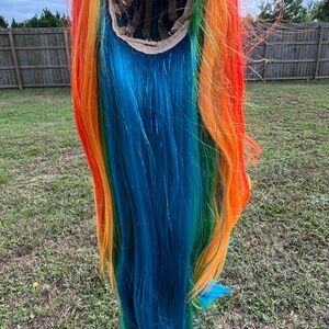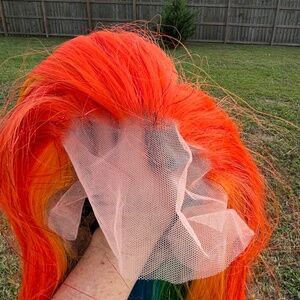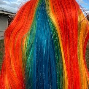 Turn heads with this vibrant Webster Wigs exclusive! This lace front wig features a stunning rainbow spectrum of fiery orange, golden yellow, bold green, and electric blue, all woven with shimmering tinsel strands for extra sparkle. Perfect for festivals, cosplay, drag, or collectors of rare Webster Wigs pieces.