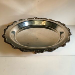 Hollowware footed round tray with pyrex insert dish. Width is 13.5 inches. Pyrex dish is 11.5 inches.
