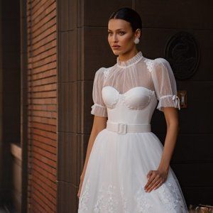 Dotted net bolero with short puffy sleeves, which are carefully tied with velvet ribbons into delicate bows, is also decorated with guipure elements.