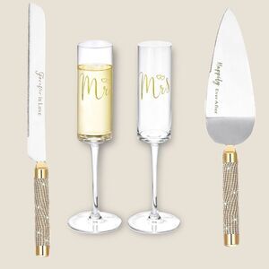 Wedding Cake Knife and Server Set and Champagne Flutes Gold Jeweled Handles