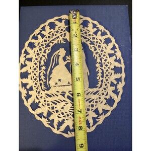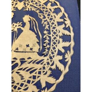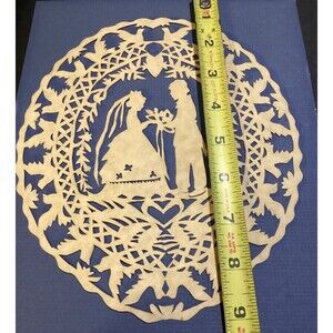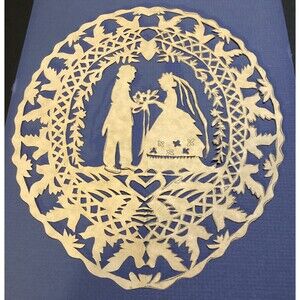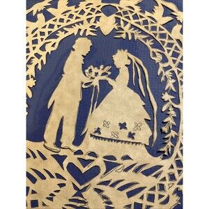This beautiful hand-cut paper art depicts a couple in silhouette, making it a perfect theme for wedding and folk art lovers. The artwork is one of a kind and framed, measuring 7x8.5 inches in height and width. The production technique used is paper cutting, and the artist is unsigned.