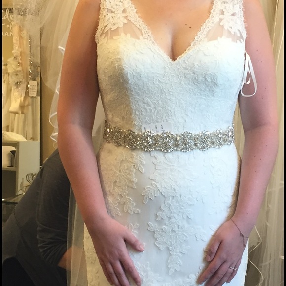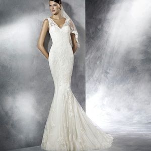 Size 16. Never been worn. Not altered. Pronovias White One - Jacy. Retails over $3200. Belt not included. Person in photo is 5'10'' and a street size 12.