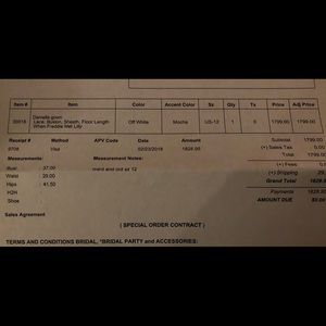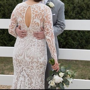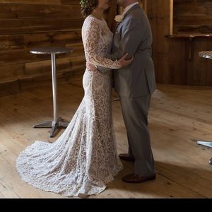 Custom wedding dress. Good, used condition. Worn to one wedding. Single owner. Altered to fit bride. 5’10” 170 lbs. Ordered size 12, let out to fit more closely to a size 14. Professionally cleaned and stored in pet free, smoke free home. Comment with any questions!