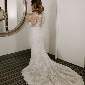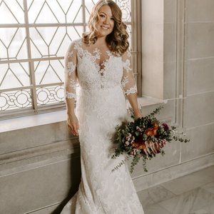 Beautiful ivory Wedding Dress bought in Walnut Creek bridal boutique (La Soie)! In EXCELLENT condition. My favorite feature of this dress is the STUNNING tattoo lacing. I originally bought it sleeveless and had 3/4 sleeves added. The sleeves could easily be taken off for a summer wedding. It has been dry cleaned and preserved but I took it out of the box to check the cleaning. Happy to report the dress is spotless. I really want someone to love it as much as I do. Ask me about it!