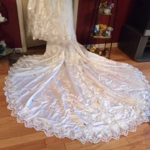 Silk and Lace, sequins and pearls throughout and raised Rose's throughout. Raised Rose on the Bow in back. Never worn.6 ft. Terrain and veil is also 6 ft. Long.