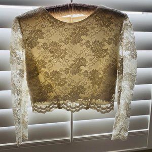 Skirt has pockets!!!! Ivory, Lace, Separate Wedding Dress. Sleeve length ends at wrist. 18 Button back on top. Skirt is high-low long train. Bustle in the back of skirt. Button and clasp on back of skirt. Lightly worn (just for city hall) Size US 2- 4 in regular sizing, and I am 5'3". Designer of skirt Tatyana Merenuyk. Designer of top Charlie BREAR Size 12.