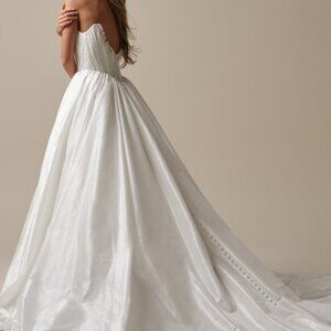 Sottero and Midgley Wedding Gown, Style: Lafayette, Size 4, Ivory, Bordeaux taffeta, Ruched Bordeaux taffeta with exposed boning and topstitching detail, Strapless sweetheart neckline with soft ruffle accent, V-back, Zipper closure over inner shapewear corset with covered buttons trailing to hem, Side slit, Bubble hem train, Pockets.