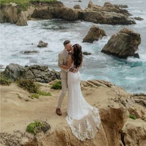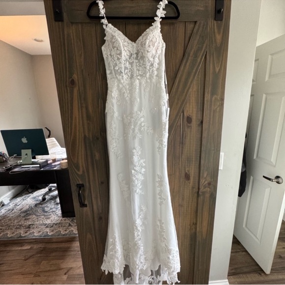 Stunning white lace gown with floral details. I inserted photos from my elopement - but this specific dress is BRAND new. I received the wrong size so they made me another one that I was able to wear on my wedding day. Size is custom but very very similar to a size 0.