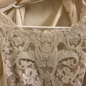 Lace wedding dress from Anthropologie. Size 4 recently, dry cleaned, and ready to use. About 1.5" was taken off and hemmed at the bottom of the dress to make it drop just below my feet and not drag as much. Extra bits of lace seen in picture 9 included along with matching thread (if needed). Gorgeous dress used for wedding and receptions.