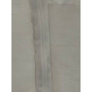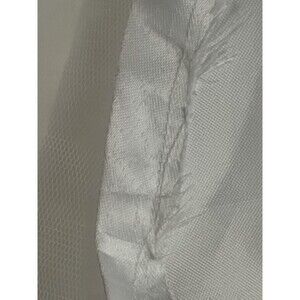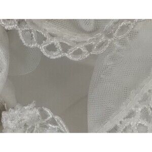 Stays in bustline and sides Netting overlay at waist. 3 tiers of netting over satin. Pouf netting sleeves with embroidery trim. 9 fabric covered buttons on front .No stains, just altered very unprofessionally.