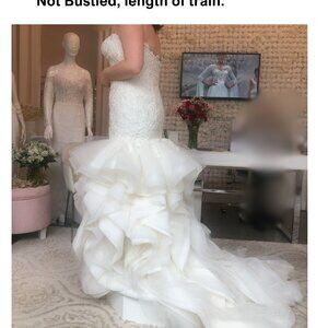 The mermaid silhouette accentuates curves in all the right places, creating a stunning and unforgettable bridal look. The luxurious and detailed beaded fabric fits beautifully and is surprisingly easy to alter – adjustments up or down in size can be easily made by a skilled seamstress by subtly adjusting the material along the back zipper of this strapless design.