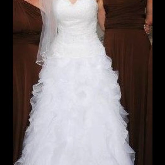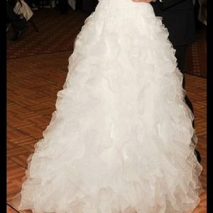 White tulle and organza ball gown with beaded lace bodice, worn once. It is a size 10 but was altered to be a size 8. Had it altered to be a sweetheart neckline and had it bustled as well. Professionally dry cleaned.