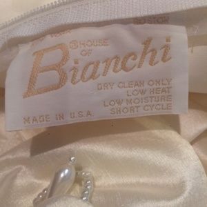 This timeless A-Line gown has an off the shoulder neckline with pearl accents on the petals. The sleeves are 3/4 length with cuff. The skirt has soft pleats and flows well with a lovely court train.It zips up the back with covered buttons.The fabric is a soft cream silk Shantung. Worn once in December of 1996, so you might call it "vintage." It was cleaned, preserved and boxed in a wedding chest shortly after the event. I only opened it to model. Wrinkles will fall out. Size 14 fits like a 12.