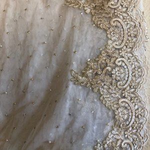 Dupatta: Net Dupatta with heavy sequins spay of antique gold and silver, and intricate trimming.