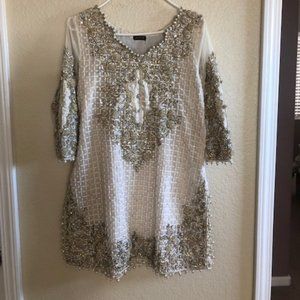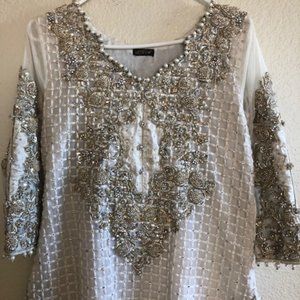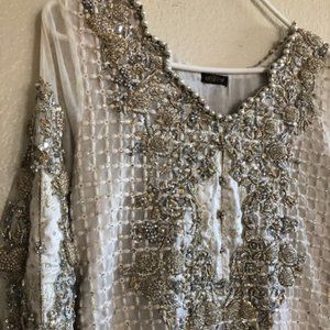 Top: Pearl encrusted neckline with heavy detailing of pearl, kora dab and stone work.