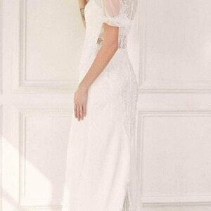 Anabel wedding dress. Embroidered with beautiful floral lace appliques over the fitted bodice, this stunner displays a plunging V-Neckline with mesh inset and has a sheer full back with zipper closure. The dress is fashioned with sheer puffy short sleeves while the skirt flows down beautifully in a floor length hem with a court train finish.