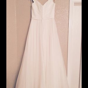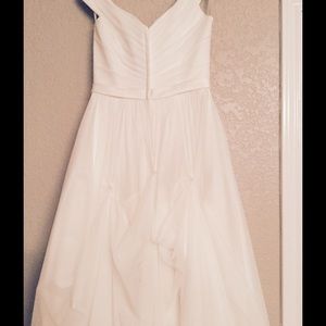 A-Line. Cap sleeves. Size 4. Color ivory. Sewn with pearls for bustle. Lace overlay. David's bridal...$500 original receipt. $300 for alterations.