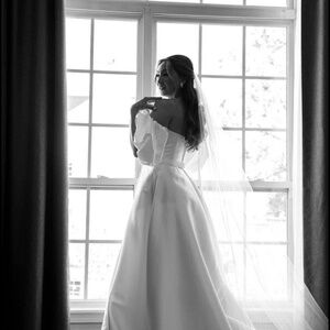 Classic and elegant wedding gown in Micado fabrics. Dress with front slit, pockets. Sleeves are detachable. Size 10-12. I can offer 2 more different sleeves as well.