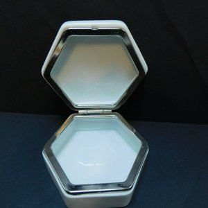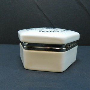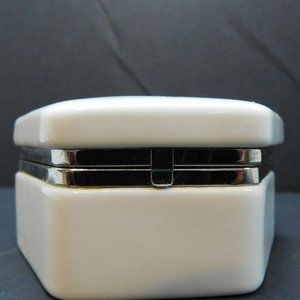 This vintage porcelain hinged box is a beautiful addition to any collection. Its hexagonal shape and glossy finish make it a perfect decorative piece for a wedding or romantic occasion. The box features a stunning boxing theme and is adorned with the brand name WWA Inc, making it a unique piece from the designer collection of 1976 Japan. Measuring small in size, this trinket box is perfect for storing keepsakes and other small items. The box comes boxed and is in excellent condition, ready to be displayed or given as a thoughtful gift. Add this porcelain keepsake box to your collection today!