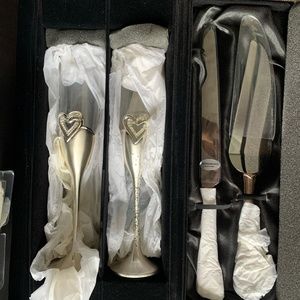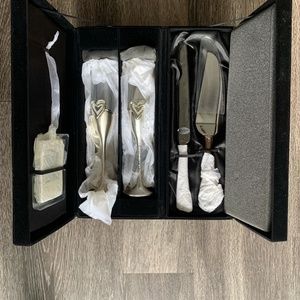 Black Velvet Kit Box , Kit includes cake cutter, cake spatula , two wedding toast flutes and a small picture frame. Stainless Steal . One glass is tarnish . Never been used .