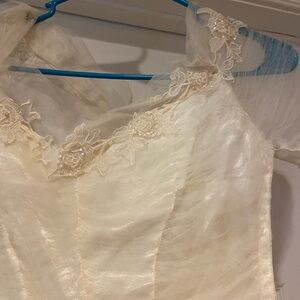Stunning off-white vintage gown with ruffled details. I think it is a hand sewn dress. Length is all the way to the floor +. Waist 26”, bust 33” so it would fit XS or S.
