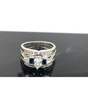 Wedding Set Diamond Blue Sapphire 14K White Gold Engagement Ring Band Size 5.25