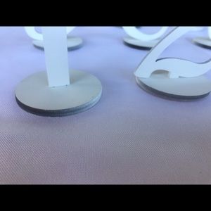 Made of wood and spray painted white, but you can re-spray it any color! I have numbers 1-12 sprayed white and 13-15 were other colors I tried that you can re-spray. Some of the bottoms are a darker color (see pics), but you can’t really tell or can re-spray them. Bottoms of base weren’t sprayed. Very cute for your reception tables or any event! Ready to ship!