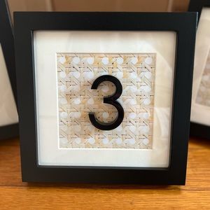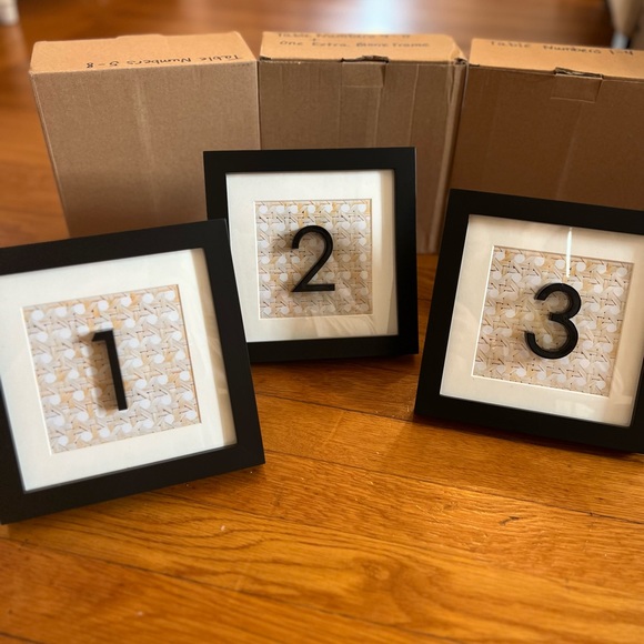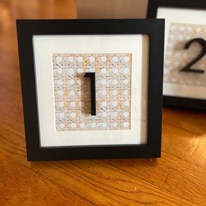 6x6 black frames with white matting table numbers. Interior natural rattan pattern background. 3D black number attached to the front of the frame. The rattan on the inside is beautiful but could be changed out for any pattern you want! Table numbers 1-11 complete. Comes with one blank extra frame with no number on it. Also comes with extra numbers to make additional table numbers if needed.