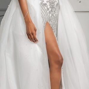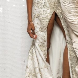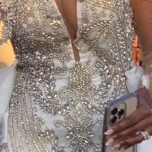 Beaded, sparkly dress with over skirt. Long train on dress and overskirt. Very heavy dress. Dress had a zipper but I didn’t like it so it was removed and the split was opened up to hit higher on the thigh. Corseted lace up back for a cinched, perfect fit. Feel free to ask any other questions. Dress has not been dry cleaned and my have dirt spots at the bottom from where the dress drags.