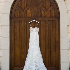 Worn once but cleaned and preserved with a 30 year guarantee. Size 12 but can be altered to fit a smaller person. Lots of beautiful detail. Straps can be removed as well for a strapless dress. Already includes the tail holder for reception. My height is 5’7” and was able to wear 3 inch heels with it. Can be altered for shorter person. Price is negotiable.
