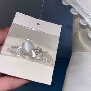 Never warn, tags on. Silky white in great material. The back is long but not too long but you’ll look great walking down the aisle! Size 10p which would be maybe a small/medium. Incredibly cheap price for this beautiful dress. Comes with extra accessories just incase in need, if you’re 5’1 and under (in height), this dress is for you! (We will ship!)