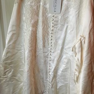 Ivory satin dresses with lace work overlay and small train. Sweetheart neck line, optional belt, lace trimmed bottom. Really a beautiful, classic dress. Was bought at a sample sale, tag still on, orig price $3000, perfect condition, just needs to be steamed and pressed!