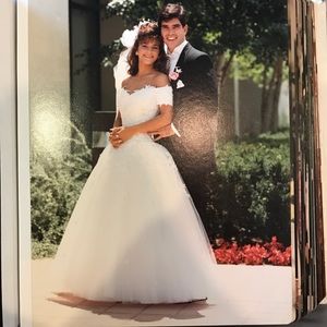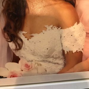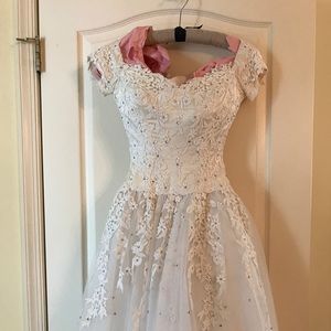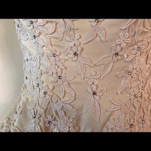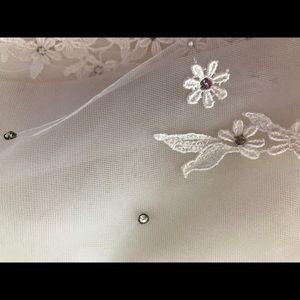 Beautiful white Diamond Collectioon wedding gown. Sweetheart neckline with appliqué daisies and toile bottom. Petite size 0-2