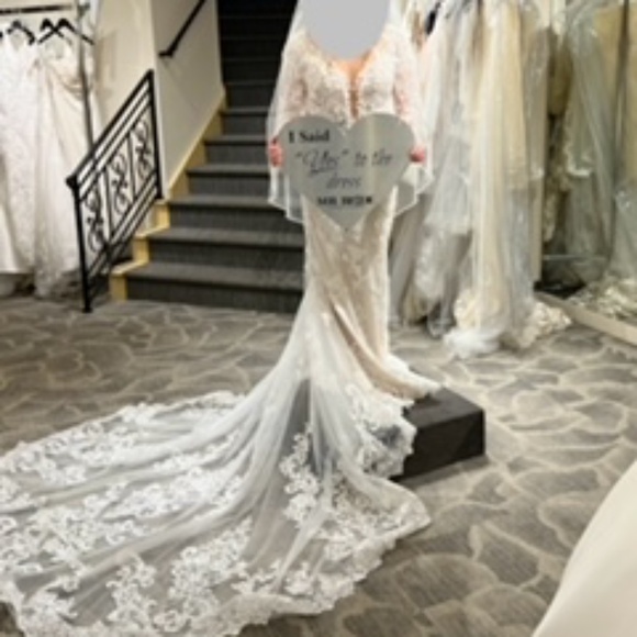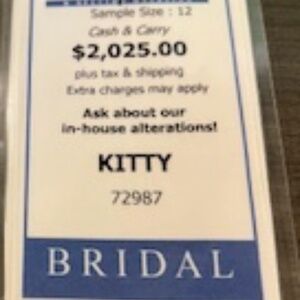 Beautiful wedding gown, never worn or altered. Has a cloth garment bag. The color is ivory/nude/tan. The dress is a size 12. The dress was $2000.00 asking $1000.00