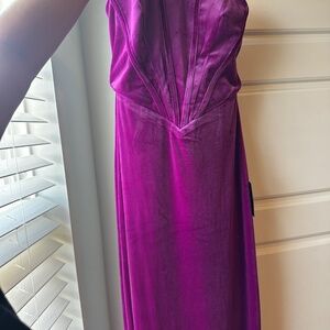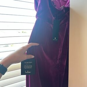 Long velvet pink/purple brand new with tags wedding guest dress from lulus. Size xs but can fit up to a small.