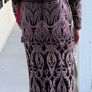 Size 8 Elegant brand new rose gold and black dress. It had 2 mesh cut out with a front slit.
