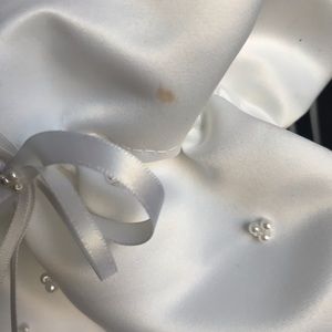 Little wedding pouch with faux pearls brand new in box .a little tiny spot I have never seen it until I got home, very unknown.