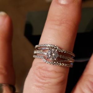 This is a gorgeous 3 ring wedding set! The center stone of the engagement ring is .8 Ct white saphire and all side stones are CZ. All three rings are 925 Sterling Silver. She will love it! Just in time for Christmas!