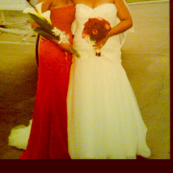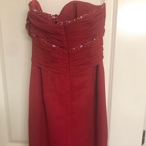 Perfect choice for a formal affair. Long dress fitted through the top of the hip with a slight flare out. The top of the dress is adorned with a few jewels in the front & back, which cascade down to the waist area. The best part of the dress is the jewels perk behind the material as you move. It’s a size 10 but I’d say more like an 6. Worn once for my sisters wedding ☺️