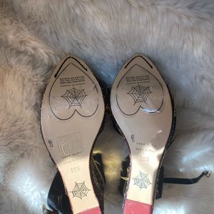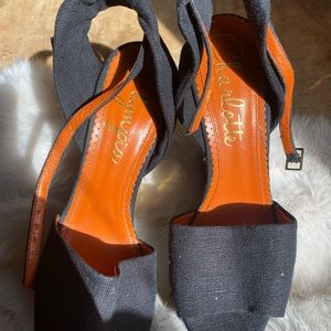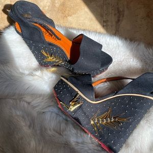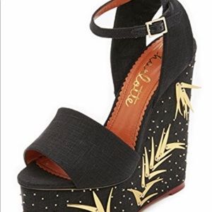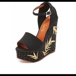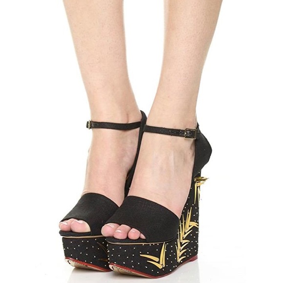 Metallic sequins and needs accents the inset, covered platform on these glamorous Charlotte Olympia Wedges. Slim buckle ankle strap. Leather sole.