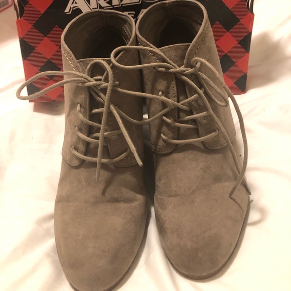 EUC wedge booties. Super comfortable and perfect for fall. Color is listed as mushroom on the box, it’s a light taupe grey.
