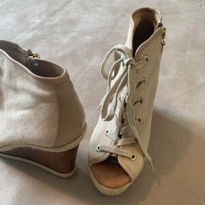 Wedge Boots Matt Bernson FNL - size 7. Canvas upper with leather heel cup and trim. The color is natural with a brown wooden wedge heel. Front of the shoe has a lace up detail with gold eyelets and there is a gold zipper at inside of boot. Part sneaker/ part wedge. There was a shoe insert placed inside the shoe for extra comfort (which can be removed) These shoes have been worn once and in perfect condition.
