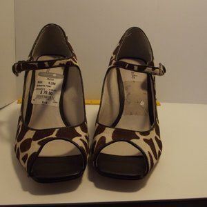 These are new but there are a couple of scuffs on the leather sole. SEE PICTURES ALL PICTURES... Brand is "Facade" - style is "Ella" - stacked heel of 4 inches. Mary Jane style strap in the front with snap. Giraffe Pony print - peep toe - All leather upper and sole. Great condition. There was a tag inside the shoe and there is a mark where it was taken off. I have left the other tag on the other shoe for the buyer to remover. Small number written on bottom of one shoe - display model?