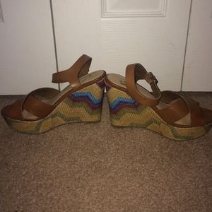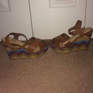 Brown w/ multicolored accents on wedge. About 4 in tall. The shoe doesn't have the size on it but it fits a 6. Worn once. No signs of wear at all! (: